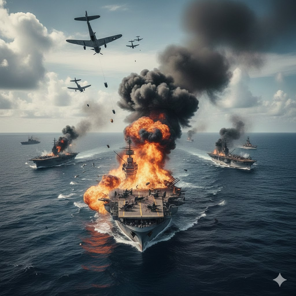 오전 10시 22분, 구름 사이로 나타난 미군의 SBD 돈틀리스 급강하 폭격기 부대가 일본 항공모함을 향해 수직으로 내리꽂혔습니다. 일본 함대는 공격을 위해 갑판 위에 가솔린과 폭탄을 가득 실은 채 재무장 중이었고, 이는 치명적인 약점이 되었습니다.
