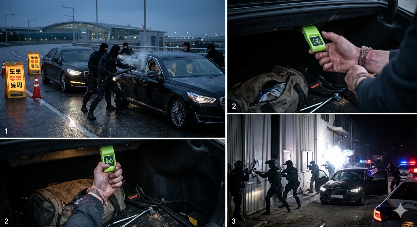 납치된 지 약 3시간이 경과한 시점, 범인들의 차량은 인천 영종도 외곽의 외딴 폐창고로 향하고 있었습니다. 피해자 중 한 명인 A 사장은 평소 차량 안전 기술에 깊은 관심을 가지고 있었으며, 자신이 탑승한 차량의 트렁크 내부에 비상 탈출 레버가 있다는 사실을 기억해냈습니다. 비록 결박된 상태였으나, 그는 동료들과의 눈빛 교환을 통해 범인들이 방심한 틈을 타 결박을 느슨하게 만드는 데 성공했습니다.